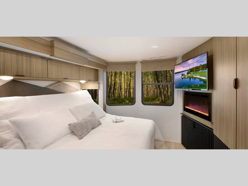 There is a heated and enclosed Accessibelly that will provide protection against the elements and road debris during transport. Residential features, such as stainless-steel kitchen appliances and stylish roller shades will let you enjoy extended stays in comfort. A tankless water heater will provide endless hot showers, and you'll stay entertained with the JBL stereo!