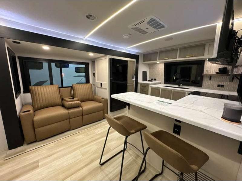 Sleeps 7 Slides 3 Length 38 ft 1 in Ext Width 8 ft Ext Height 11 ft 8 in Hitch Weight 1245 lbs Dry Weight 9333 lbs Cargo Capacity 2112 lbs Fresh Water Capacity 45 gals Grey Water Capacity 66 gals Black Water Capacity 30 gals Number Of Bunks 2 Available Beds Queen Refrigerator Type 12V Refrigerator Size 10 cu ft Cooktop Burners 3 Shower Size 30" x 36" Number of Awnings 2 Water Heater Type On Demand Tankless AC BTU 31500 btu TV Info LR 50" LED Smart TV Awning Info 10' and 12' with LED Lights Axle Count 2 Washer/Dryer Available Yes Shower Type Standard Electrical Service 50 amp Similar Floorplans