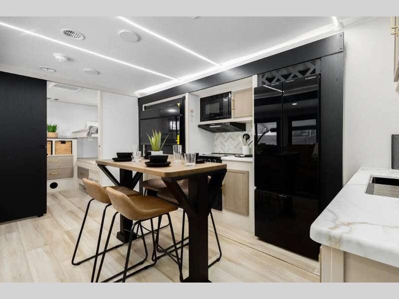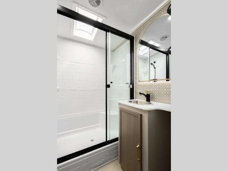 Sleeps 3 Slides 2 Length 33 ft 1 in Ext Width 8 ft Ext Height 11 ft Hitch Weight 1160 lbs Dry Weight 8243 lbs Cargo Capacity 1717 lbs Fresh Water Capacity 49 gals Grey Water Capacity 90 gals Black Water Capacity 30 gals Available Beds Custom King Refrigerator Type 12V Refrigerator Size 10 cu ft Cooktop Burners 3 Number of Awnings 1 Water Heater Type On Demand Tankless AC BTU 31500 btu TV Info LR 50" LED Smart TV Awning Info 19' with LED Lights Axle Count 2 Washer/Dryer Available Yes Shower Type Radius Electrical Service 50 amp Similar Floorplans