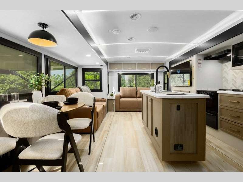 Sleeps 5 Slides 3 Length 38 ft Ext Width 8 ft Ext Height 11 ft 8 in Hitch Weight 1185 lbs Dry Weight 9543 lbs Cargo Capacity 1842 lbs Fresh Water Capacity 45 gals Grey Water Capacity 90 gals Black Water Capacity 30 gals Available Beds King Refrigerator Type 12V Refrigerator Size 10 cu ft Cooktop Burners 3 Number of Awnings 2 Water Heater Type On Demand Tankless AC BTU 31500 btu TV Info LR 50" LED Smart TV Awning Info 12' and 14' with LED Lights Axle Count 2 Washer/Dryer Available Yes Shower Type Standard Electrical Service 50 amp Similar Floorplans